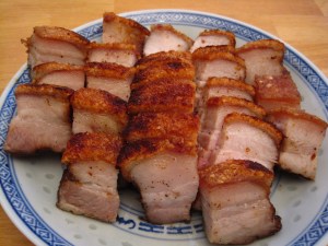 This is incredibly easy to make and tastes just like the siu yuk (roast pork belly) that you buy at the Chinese restaurants and grocery stores. I suggest buying the meat from an Asian grocery store because it is much much cheaper there. Make sure you buy the boneless pork belly with the skin/rind on. Pork side also works. You want to choose a cut of meat that has an even thickness so that the rind cooks evenly, otherwise sections of the skin will burn. But if this happens you can always scrape the burnt parts off with a knife before serving. I tested three different methods of making crispy siu yuk. The simplest method involved brushing oil onto the rind prior to baking; the second method involved brushing the skin with vinegar before drying it out in the fridge; and the third method involved scalding the rind with vinegar and boiling water prior to refrigeration. From my experience, the rind that had been brushed with vinegar crackled the soonest. Scalding the rind resulted in a very crunchy, but tough, skin. I have posted the method that, in my opinion, was the best.