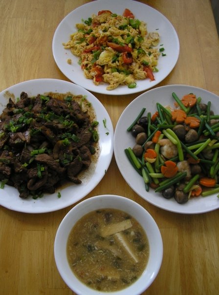 Picture below from top moving clockwise: tomato eggs, shrimp and garlic shoots stir fry, hot and sour soup, mongolian beef. See the Asian category for the rest of the recipes.