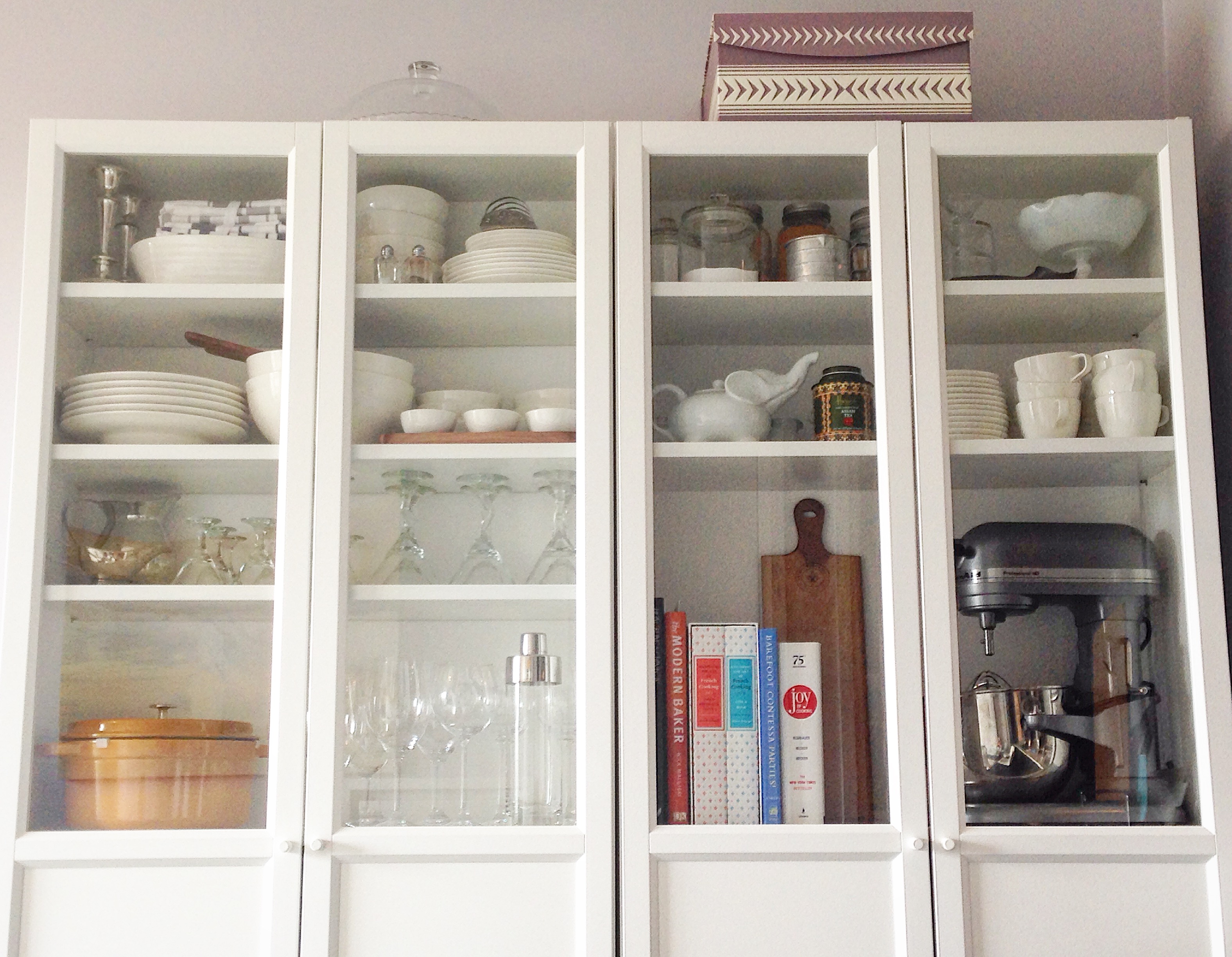 Once it became apparent that John and I would be living in our condo for longer than originally planned, I did some redecorating with storage solutions in mind. For our open concept kitchen, dining, and living area, I purchased affordable bookcases with partial glass paneled doors (see Ikea’s Billy bookcases here). I was so excited to take (some of) my beloved serveware out of storage boxes. It took some research and many tries before I was satisfied with how they were displayed, so I’m sharing some tips on how to style your dining room hutch and kitchen cabinets. I would LOVE to see photos of your arrangements!