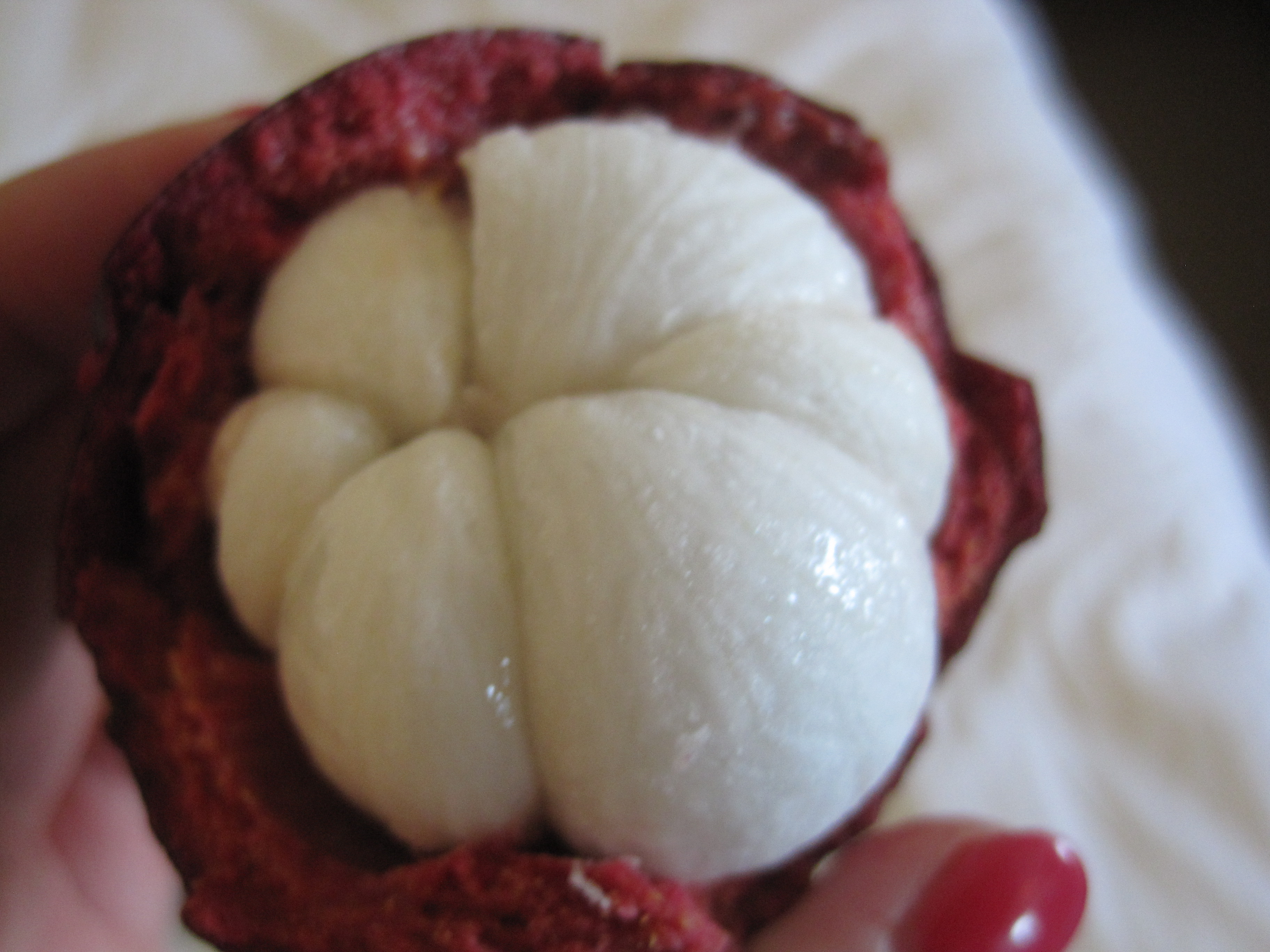 The purple outer shell is inedible. To open a mangosteen, crush the purple shell between the palms of your hands and then pull it apart to open it. But be very careful not to stain your clothes, because the purple dye is almost impossible to wash out. In fact, many hotels in Southeast Asia ban their guests from bringing mangosteen into their rooms. The white flesh on the inside of the fruit is soft, moist, juicy and refreshing and light tasting. Also, there are large seeds within each lobe of the white flesh.