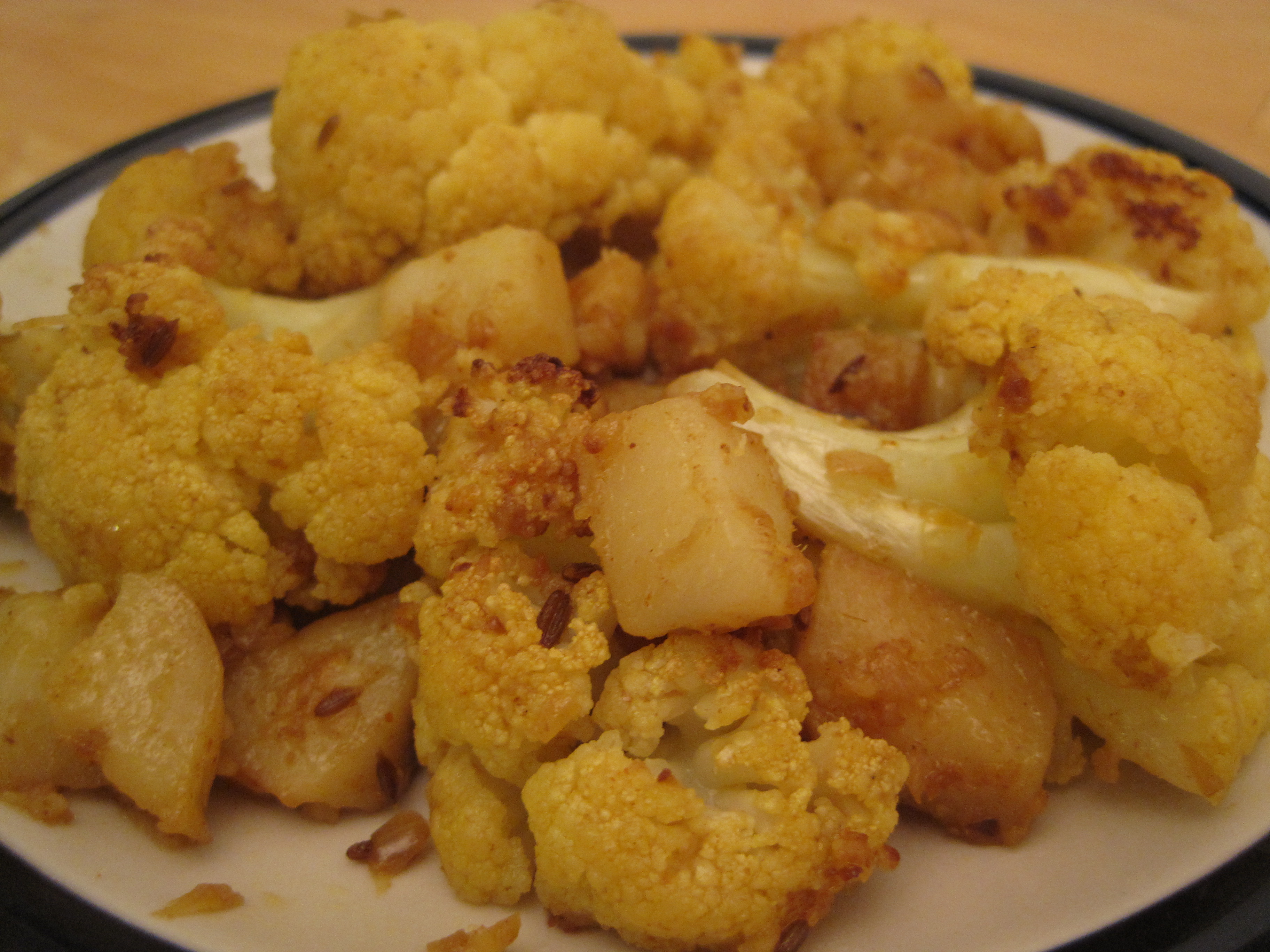 In Indian on February 20, 2010 at pmI rarely eat cauliflower because I find it so tasteless. When a creamy, cheesy, cauliflower gratin that I made still wasn’t enough to change my mind, I gave up on this vegetable for a long time. But I recently read about the nutrition and health benefits of cauliflower, so I thought it was time to give it another chance. While searching for interesting ways to cook it, I found aloo gobi, an Indian spiced potato and cauliflower dish. It was perfect because I just happened to be binge-cooking indian this month. This dish still wasn’t enough to make me crave cauliflower, but it’s a great side to a curry meat dish (and Ed loved it), so I’ll definitely make it again. See here for tips on how to get the most flavour out of your Indian spices.