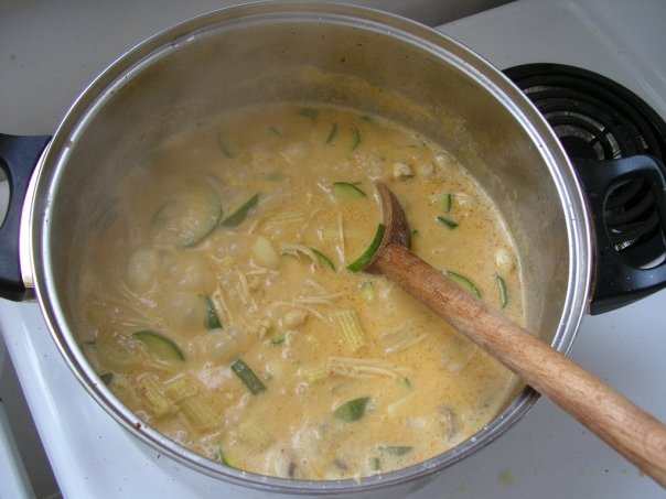 In Other Asian Foods on February 26, 2010 at pmThai red curry is spicier than yellow curry but milder than the green (link to my green curry recipe here). These are incredibly easy to make and like Chinese stir fries, you can pretty much throw in any meat and/or vegetables that you happen to have around. I like to make these with chicken and at least 2 types of differently coloured vegetables. Personally, my favourite thing to put into a thai red curry is fresh Japanese enoki mushrooms. This curry is great when made to be vegetarian/vegan too.